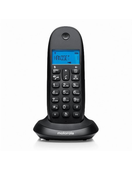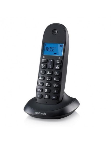 Telefone fixo sem fios Motorola C1001CB+. Compatível com DECT/GAP. Permite conectar até 5 telefones. Ecrã alfanumérico com retroiluminação. Autonomia de bateria de até 6,5 horas em conversação e 135 horas em standby.