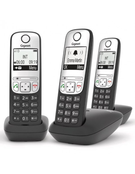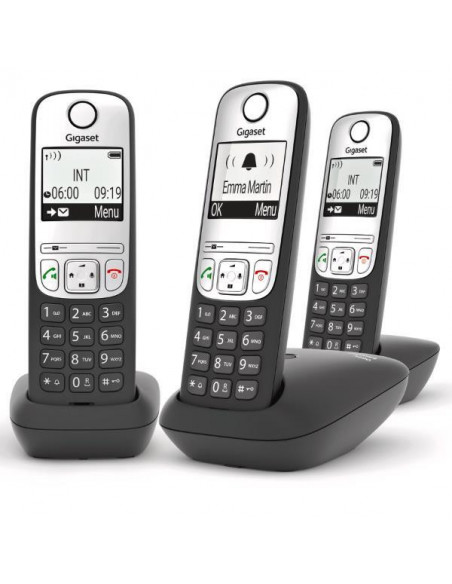 Telefone fixo sem fios Gigaset A690 Trio, preto, com três portáteis. Ideal para famílias.  Tecnologia DECT/GAP, alcance sem fios, kit mãos-livres, ecrã retroiluminado.  Até 100 contactos e lista de chamadas com 32 registos. Sem VoIP nem SMS.