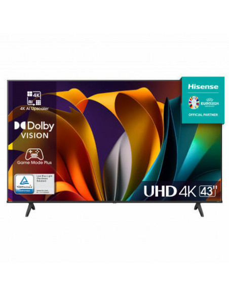 Televisor Hisense 43A6N, um modelo Smart TV de 43 polegadas com resolução Ultra HD 4K (3840x2160 pixels). Desfrute de imagens nítidas e vibrantes com suporte para HDR10+, Dolby Vision e uma ampla gama de cores. Este televisor possui um processador Quad Core e funcionalidades inteligentes como acesso a aplicações como Netflix, Prime Video e YouTube. O sistema operativo é VIDAA U7.6. Inclui várias opções de conectividade, como HDMI, USB e Wi-Fi.