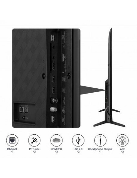 Hisense 85A6K. Tamanho do ecrã na diagonal: 2,16 m (85"), Resolução: 3840 x 2160 pixels, Tipo de HD: 4K Ultra HD, Tecnologia de apresentação: LED, Formato do ecrã: Plano, Tipo de retroiluminação LED: Direct-LED. Smart TV. Tempo de resposta: 8 ms, Rácio de contraste (típico): 6000:1, Proporção de imagem nativa: 16:9. Sistema de formato de sinal digital: DVB-C, DVB-S, DVB-S2, DVB-T, DVB-T2. Wi-Fi, Ethernet LAN. Cor do produto: Preto