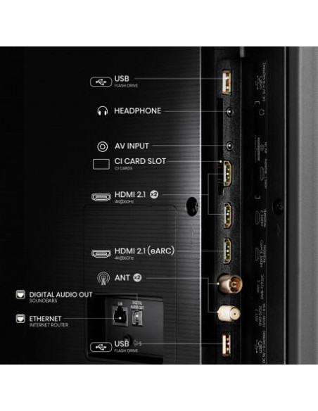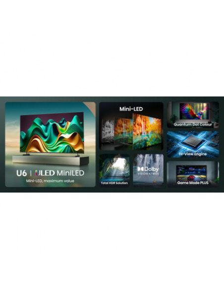 Hisense 65U6NQ. Tamanho do ecrã na diagonal: 165,1 cm (65"), Resolução: 3840 x 2160 pixels, Tipo de HD: 4K Ultra HD, Tecnologia de apresentação: QNED MiniLED, Formato do ecrã: Plano, Tipo de retroiluminação LED: Mini LED. Smart TV. Luminosidade: 600 cd/m², Tempo de resposta: 8 ms, Rácio de contraste (típico): 5000:1, Proporção de imagem nativa: 16:9. Sistema de formato de sinal digital: DVB-C, DVB-S, DVB-S2, DVB-T, DVB-T2. Wi-Fi, Ethernet LAN. Cor do produto: Cinzento