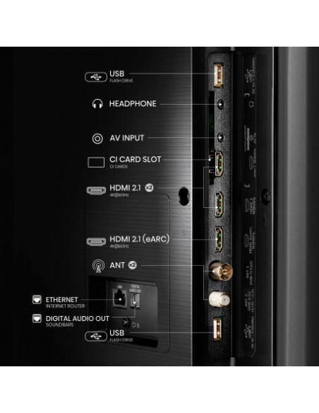 * **Portas:** Múltiplas portas HDMI 2.1, USB 2.0, saída óptica, entrada de áudio, entrada de vídeo composto