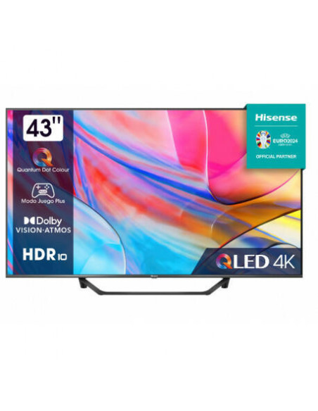 Hisense 43A7KQ. Tamanho do ecrã na diagonal: 109,2 cm (43"), Resolução: 3840 x 2160 pixels, Tipo de HD: 4K Ultra HD, Tecnologia de apresentação: QLED, Formato do ecrã: Plano. Smart TV. Luminosidade: 275 cd/m², Tempo de resposta: 8 ms, Rácio de contraste (típico): 3200:1, Proporção de imagem nativa: 16:9. Sistema de formato de sinal digital: DVB-C, DVB-S, DVB-S2, DVB-T, DVB-T2. Wi-Fi, Ethernet LAN. Cor do produto: Preto