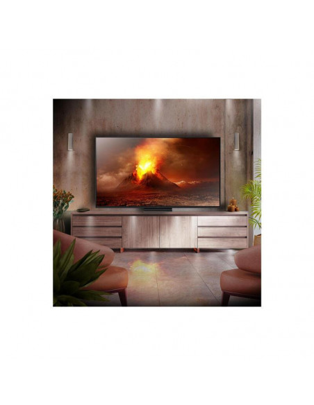 A conectividade abrange três entradas HDMI com eARC e ALLM, duas portas USB 2.0, saída óptica, Wi-Fi 5, LAN RJ45, e Bluetooth 5.1, com saída de altifalante de TV simultâneo e surround. Outras funcionalidades incluem: sintonizador DVB-T2/T, DVB-C, DVB-S2/S; EPG (8 dias); Time Machine (requer HDD 80GB-2TB); gravação programada; Time Shift (requer HDD 80GB-2TB); edição de canais TDT; e compatibilidade com câmaras web. O seu design elegante e as suas dimensões (1677x965x30.9mm) com suporte VESA 400x300 completam esta oferta superior.
