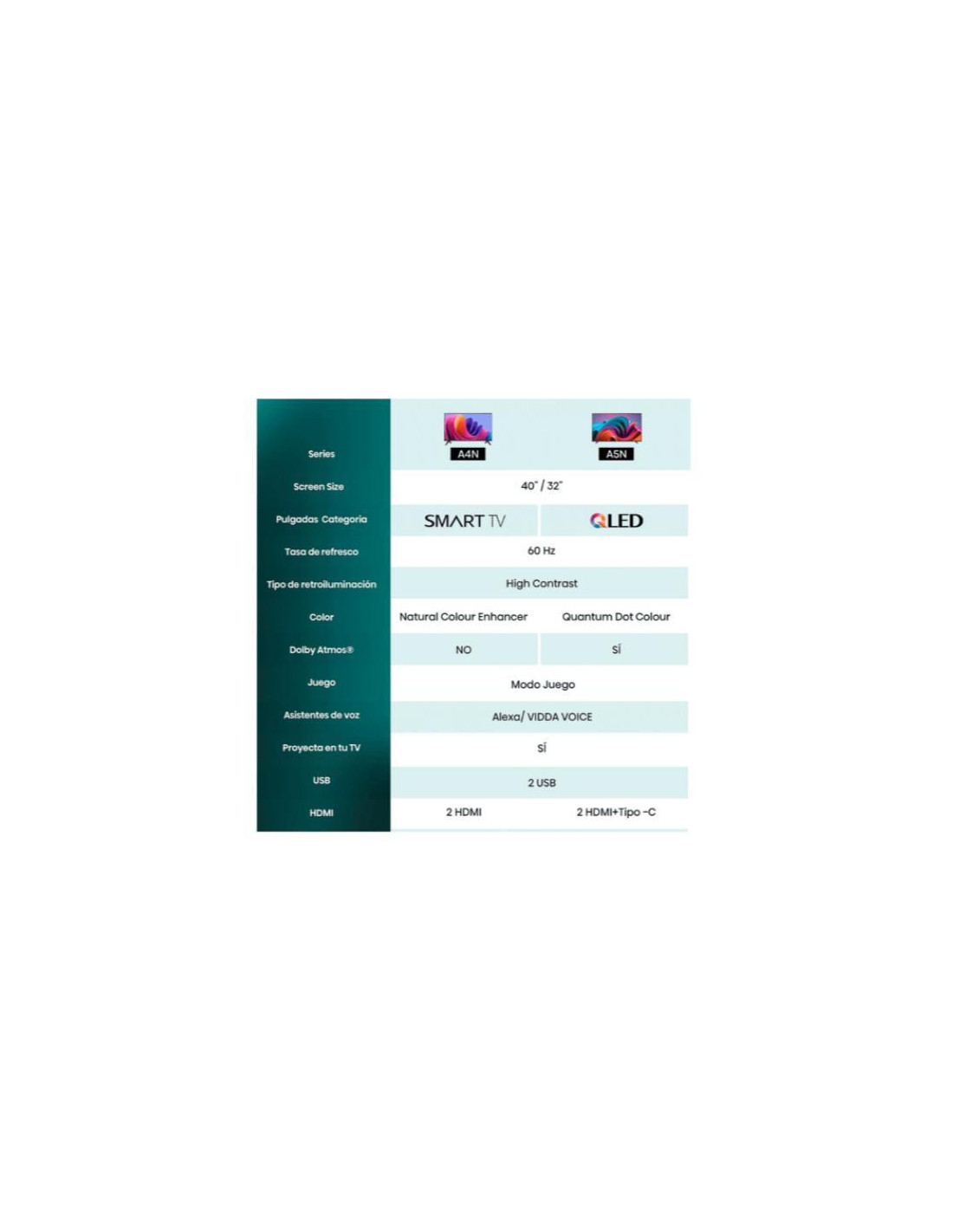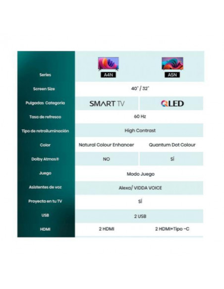 A 32A4N integra sintonizadores DVB-T2, DVB-S2 e DVB-C, garantindo compatibilidade com uma ampla variedade de sinais de televisão, seja através de antena, satélite ou cabo. Com duas portas HDMI e duas portas USB, pode facilmente conectar os seus dispositivos externos, como consolas de jogos, leitores de Blu-ray e outros equipamentos multimédia. O sistema de áudio integrado de 12W com duas colunas oferece um som claro e envolvente, complementando a experiência de visualização.