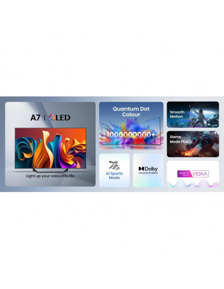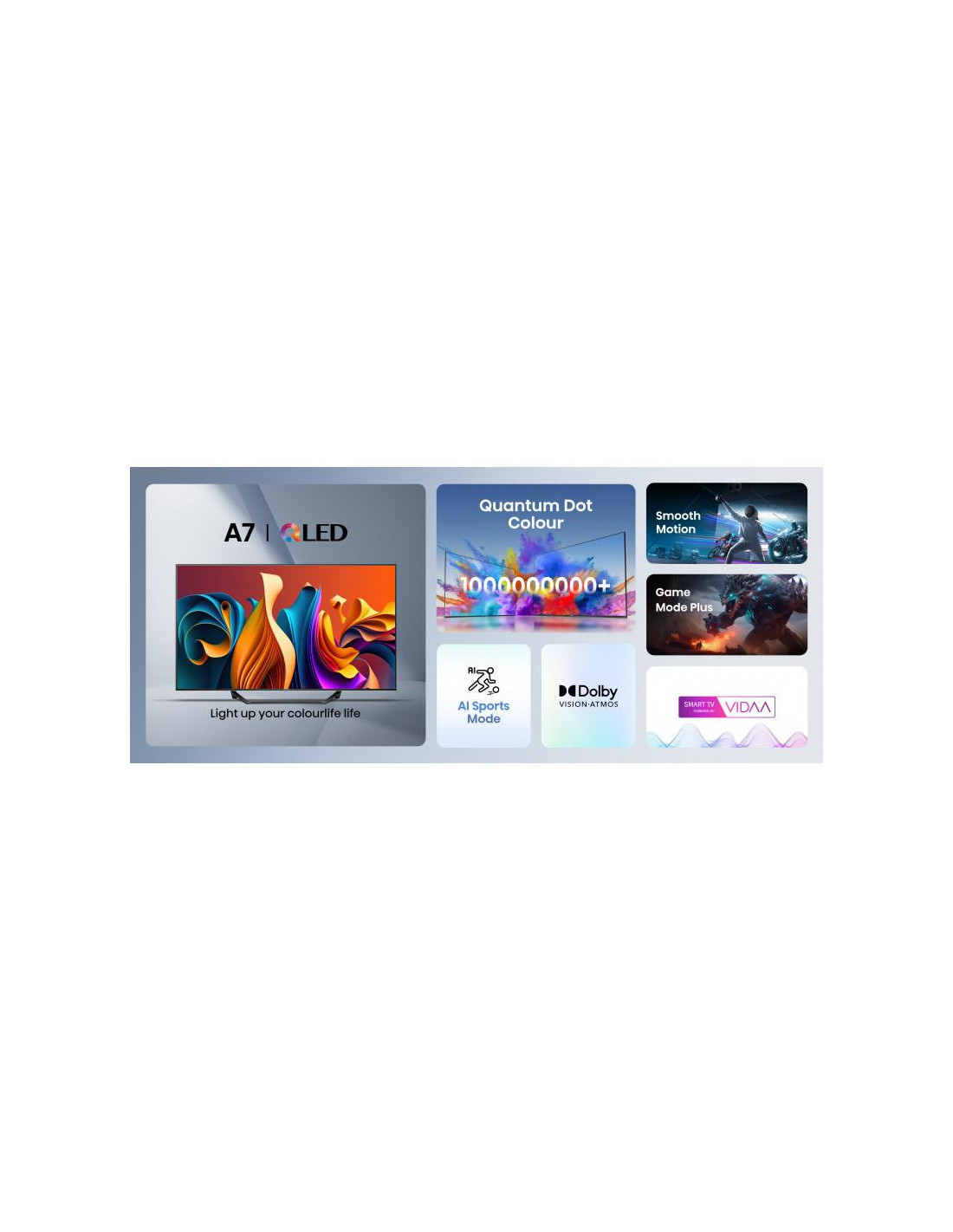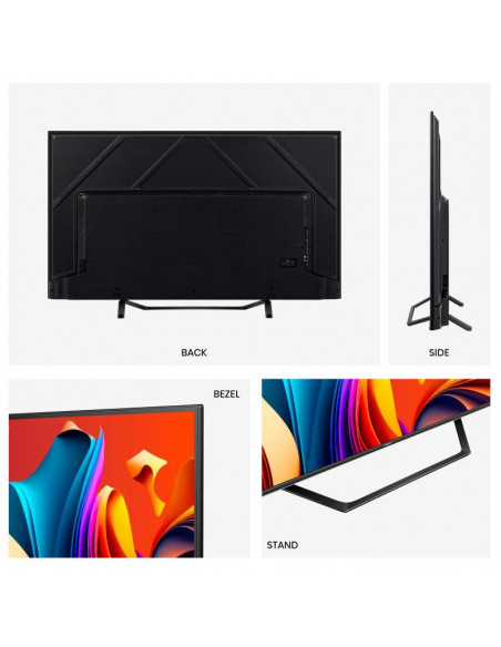 Hisense 65A7NQ. Tamanho do ecrã na diagonal: 165,1 cm (65"), Resolução: 3840 x 2160 pixels, Tipo de HD: 4K Ultra HD, Tecnologia de apresentação: QLED, Formato do ecrã: Plano, Tipo de retroiluminação LED: LED de iluminação direta. Smart TV. Luminosidade: 300 cd/m², Tempo de resposta: 8 ms, Rácio de contraste (típico): 5000:1, Proporção de imagem nativa: 16:9. Sistema de formato de sinal digital: DVB-C, DVB-S, DVB-S2, DVB-T, DVB-T2. Wi-Fi, Ethernet LAN. Cor do produto: Cinzento ;