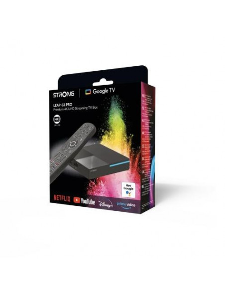 A Strong LEAP-S3 PRO é uma box de streaming multimédia que oferece uma experiência de visualização 4K Ultra HD.  Este dispositivo compacto integra um sistema operativo Android 12, permitindo acesso a uma vasta gama de aplicações de streaming, jogos e outras funcionalidades. A resolução de vídeo máxima de 3840 x 2160 pixels garante imagens nítidas e vibrantes, enquanto a compatibilidade com HDR10, HDR10+ e HLG proporciona maior realismo e detalhe nas cores. O processador Amlogic RTD1325 quad-core a 1,7 GHz, combinado com 4GB de RAM DDR4, assegura um desempenho suave e eficiente, mesmo com múltiplas aplicações abertas em simultâneo. Com 32GB de armazenamento interno eMMC, dispõe de espaço suficiente para instalar aplicações e armazenar ficheiros multimédia.  A conectividade é garantida por Wi-Fi de alta velocidade (802.11a/b/g/n/ac/ax) e Bluetooth 4.2, permitindo fácil ligação a outros dispositivos. A box possui duas portas USB para ligar periféricos como discos rígidos externos ou teclados.  A interface inclui HDMI 2.1, oferecendo compatibilidade com os mais recentes televisores e monitores 4K.  O seu design elegante e compacto, na cor preta, integra-se facilmente em qualquer ambiente. Inclui comando remoto e manual de utilizador.  O dispositivo opera numa gama de temperatura de 0 a 40°C, e pode ser armazenado entre -10 e 70°C.  A sua dimensão compacta (96mm x 96mm x 20mm) e peso de 158g tornam-na portátil e fácil de instalar.