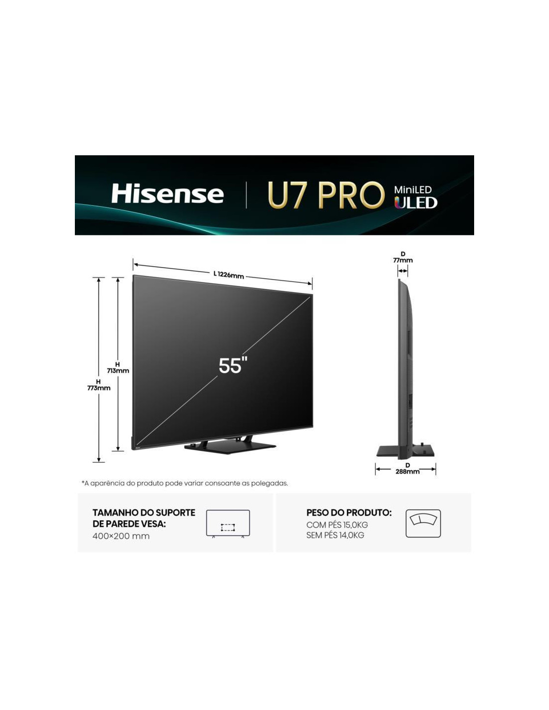Televisor Hisense 55U7Q PRO com ecrã de 55 polegadas e resolução 4K Ultra HD (3840 x 2160 pixels). Tecnologia ULED com retroiluminação Mini LED PRO para cores vibrantes e alto contraste. Smart TV com sistema Vidaa. Inclui várias opções de conectividade, incluindo Wi-Fi e Ethernet. Design plano e elegante em cor preta.