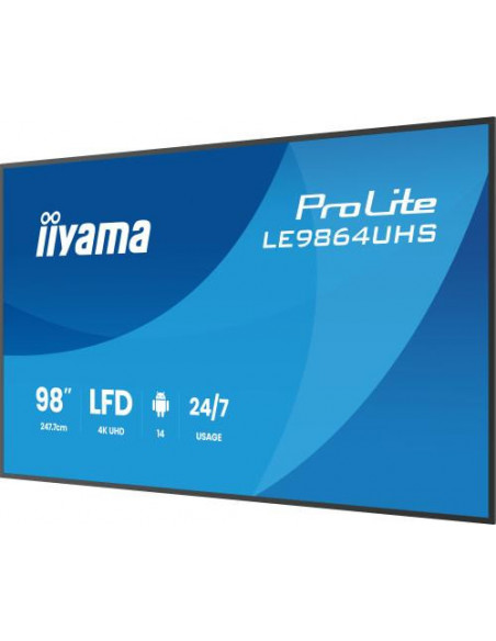 Televisor profissional Iiyama LE9864UHS-B1AG de 98 polegadas com resolução UHD (3840x2160 pixels), painel VA DLED com brilho de 500 cd/m². Ideal para utilização 24/7, inclui sistema operativo Android 14 e funcionalidades de sinalização digital. Inclui suporte de parede. Principais características: