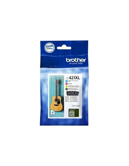 Pack de 4 tinteiros Brother LC421XLVAL de alta capacidade: 1 preto, 1 ciano, 1 magenta e 1 amarelo. Cada tinteiro tem uma duração estimada de até 500 páginas (ISO/IEC 24711). Compatível com as impressoras DCP-J1050DW e MFC-J1010DW.