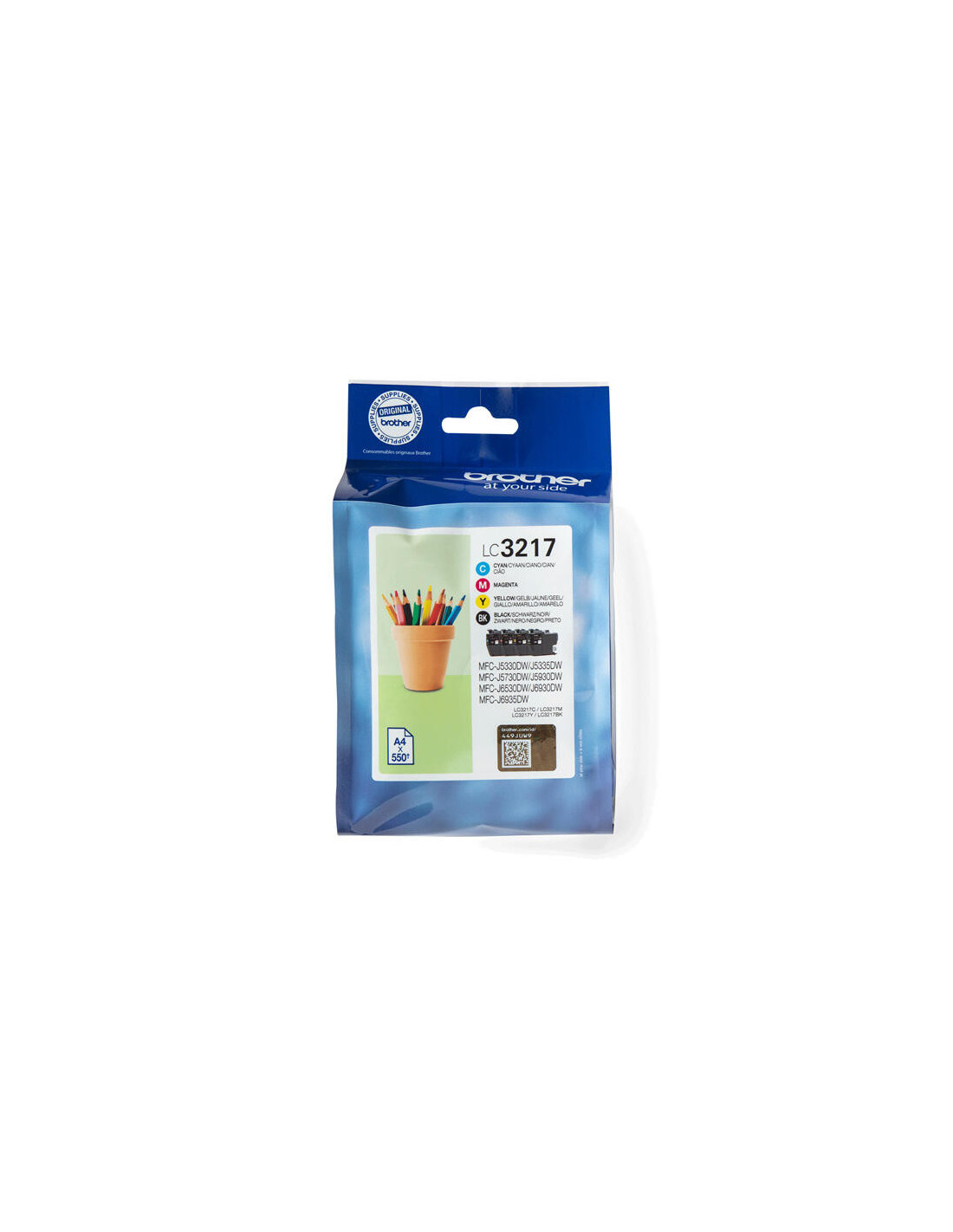 Pack de quatro tinteiros Brother LC3217VAL, contendo um tinteiro preto e três cores (ciano, magenta e amarelo).  Tinta à base de pigmentos para impressões de alta qualidade e durabilidade.  Compatível com impressoras Brother específicas.  Verifique a compatibilidade antes da compra.