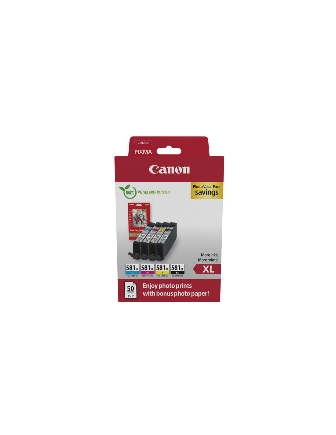 Canon CLI-581XL C/M/Y/BK Photo Value Pack - Pack de 4 - 8.3 ml - XL - preto, amarelo, azul cyan, magenta - original - caixa - kit tinteiro / papel - para PIXMA TS6251, TS6350, TS6351, TS705, TS8252, TS8350, TS8351, TS8352, TS9550, TS9551