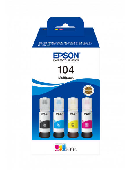 A recarga de tinta Epson EcoTank 104 é um multipack contendo tintas originais Epson para impressoras da linha EcoTank. Este conjunto inclui garrafas de tinta preta, ciano, magenta e amarela, proporcionando impressões de alta qualidade com cores vibrantes e texto nítido. Cada cor tem um volume de 65 ml, oferecendo um rendimento suficiente para inúmeras páginas. As tintas são concebidas para garantir cores precisas e duradouras, resultando em impressões profissionais e de alta qualidade.