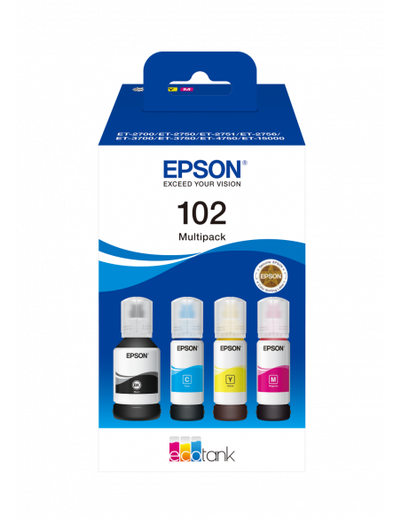 A recarga de tinta Epson EcoTank 102 é um conjunto multipack contendo tintas originais Epson para impressoras da linha EcoTank. Este conjunto inclui garrafas de tinta preta, ciano, magenta e amarela, permitindo a impressão de uma vasta gama de documentos e imagens com cores vibrantes e texto nítido. As tintas são formuladas para oferecerem resultados de impressão de alta qualidade, garantindo cores precisas e duradouras. A tinta preta apresenta um volume de 127 ml, enquanto as tintas coloridas têm um volume de 70 ml cada.