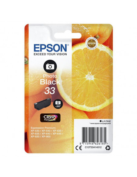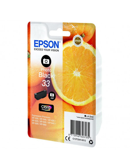 O cartucho de tinta Epson 33 Preto Foto original oferece qualidade de impressão superior para as suas fotografias e documentos.  Com uma capacidade de 4,5ml, este cartucho garante um número significativo de impressões antes de necessitar de substituição.  A tinta Claria Premium Ink da Epson proporciona cores vibrantes e nítidas, com detalhes excepcionais. Este cartucho é compatível com uma vasta gama de impressoras Epson, incluindo os modelos Expression Home XP-530, XP-630, XP-635, XP-830 e Expression Premium XP-530, XP-540, XP-630, XP-635, XP-640, XP-645, XP-830, XP-830 Stickers e XP-900.  Para garantir a compatibilidade com a sua impressora, verifique a lista completa de modelos compatíveis antes de efetuar a compra.  A tinta original Epson garante os melhores resultados e protege o seu investimento na sua impressora. Para mais informações, consulte o site da Epson.
