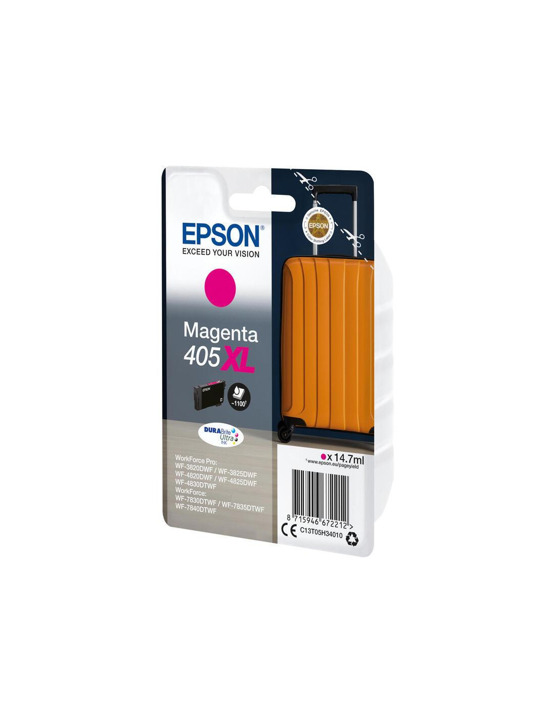 A Epson apresenta o tinteiro 405XL Magenta, um cartucho original de alta capacidade, projetado para fornecer impressões profissionais de alta qualidade.  A tinta DURABrite Ultra, utilizada neste cartucho, é de secagem rápida e resistente a manchas e à água, garantindo que os seus documentos e imagens permaneçam nítidos e vibrantes ao longo do tempo. As partículas de pigmentos revestidos de resina aderem à superfície do papel, evitando que a tinta penetre excessivamente, o que resulta em textos e gráficos tipo laser, com secagem rápida, mesmo em papéis de diferentes tipos e texturas.