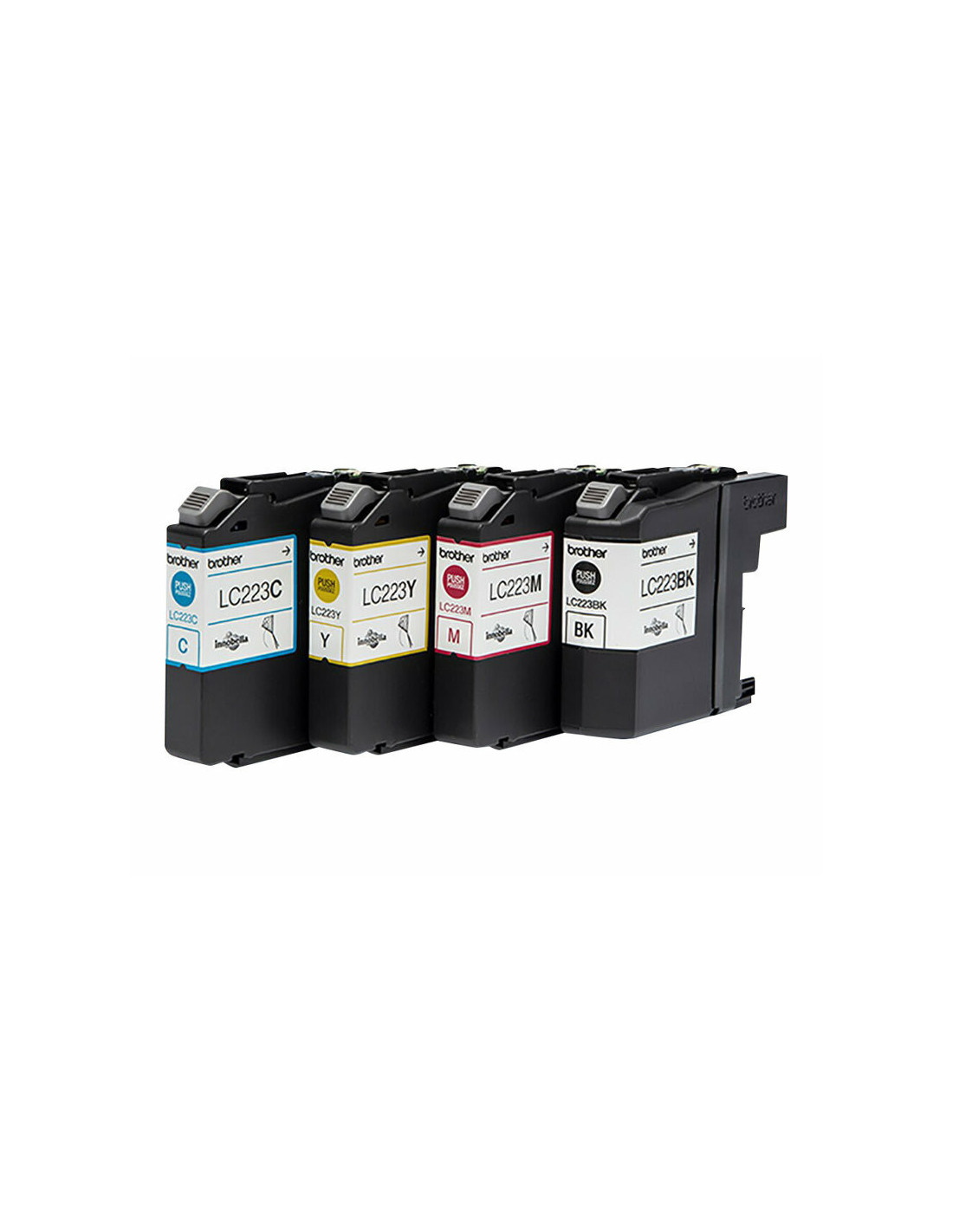 Pack de 4 tinteiros Brother LC223, contendo preto, ciano, magenta e amarelo. Cada tinteiro tem uma duração estimada de até 550 páginas (segundo ISO/IEC 24711). Garantia de 3 meses.