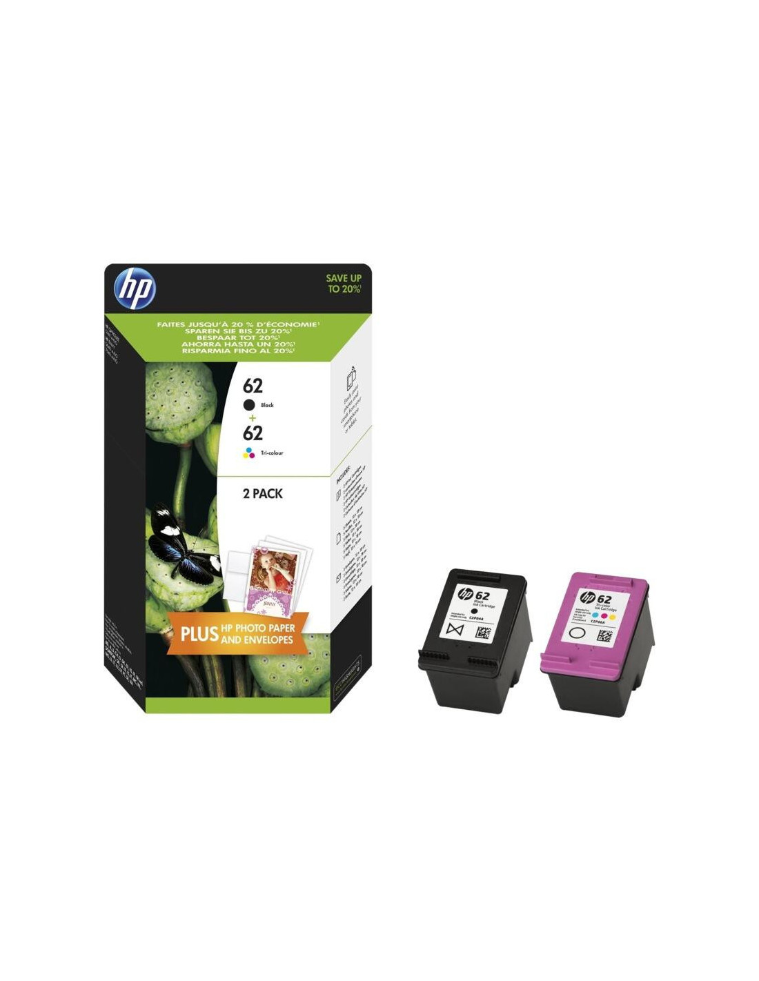 Pack com 2 conjuntos de tinteiros HP 62 originais. Inclui preto, ciano, magenta e amarelo. Rendimento de até 200 páginas (preto) e 165 páginas (tricolor). Compatível com diversas impressoras HP. * 2 Packs de Tinteiros * Cores: Preto, Cian, Magenta e Amarelo * Rendimento: até 200 páginas (Preto), 165 páginas (Tricolor) * Tecnologia de Injeção de Tinta * Compatível com várias impressoras HP (verificar compatibilidade)