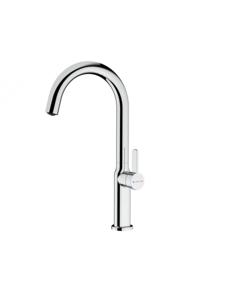 Misturadora de cozinha Teka Oval 915, cromada, da gama Total. Design elegante com cano alto giratório, filtro anticalcário e cartucho de discos cerâmicos. Tubos de alimentação flexíveis.