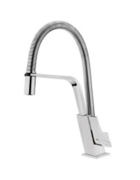 Monocomando para lava- -louças com cano giratório Filtro anticalcário Mola flexível de grande resistência Tubo flexível em aço inoxidável Chuveiro extraível com função jato ventilado Cartuchos de discos cerâmicos Tubos de alimentação flexíveis