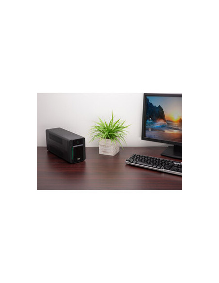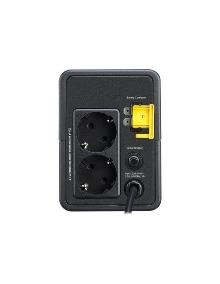 Este modelo oferece duas tomadas Schuko, permitindo conectar vários equipamentos simultaneamente. A bateria de chumbo-ácido proporciona um tempo de autonomia (a meia carga) de aproximadamente 6 minutos, suficiente para desligar os seus equipamentos de forma segura e evitar a perda de dados. O tempo de recarga completo da bateria é de 8 horas, permitindo que o SAI esteja sempre pronto para a próxima interrupção de energia. A capacidade da bateria é de 270 kJ.