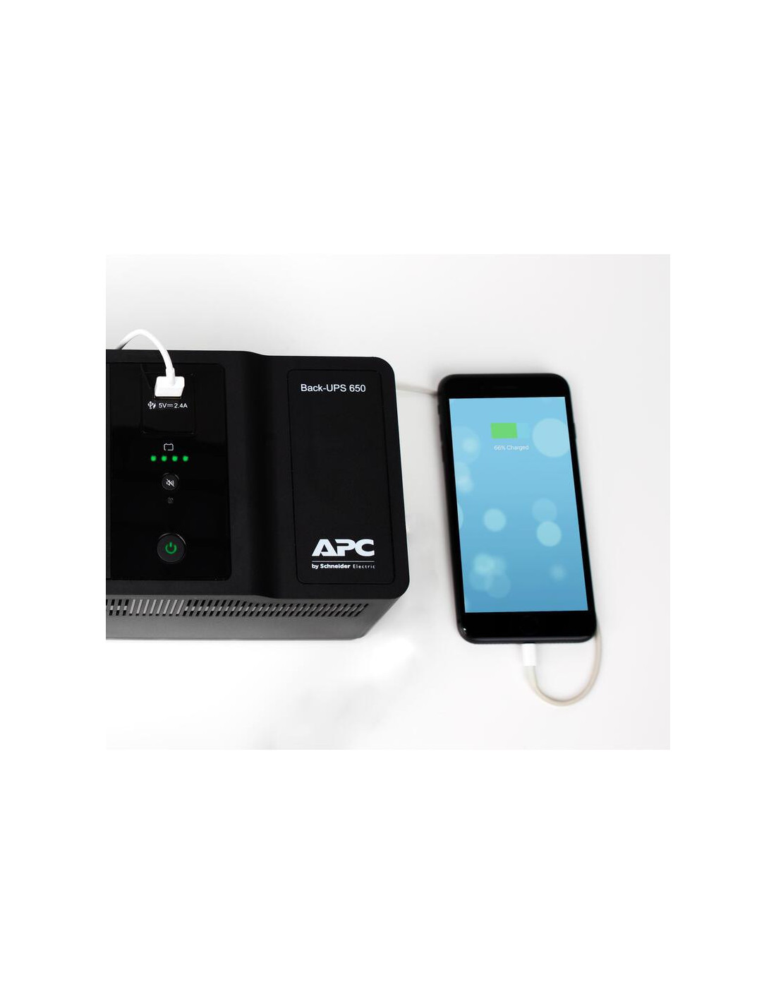 Este modelo inclui 8 tomadas CA tipo F, proporcionando conectividade suficiente para vários dispositivos. Uma porta USB adicional permite carregar os seus dispositivos móveis. O seu design compacto e a cor preta tornam-no adequado para qualquer ambiente. Para informações mais detalhadas sobre as especificações técnicas, consulte a página do fabricante: [https://www.apc.com/shop/fi/en/products/APC-Back-UPS-650VA-230V-1-USB-charging-port/P-BE650G2-GR](https://www.apc.com/shop/fi/en/products/APC-Back-UPS-650VA-230V-1-USB-charging-port/P-BE650G2-GR)