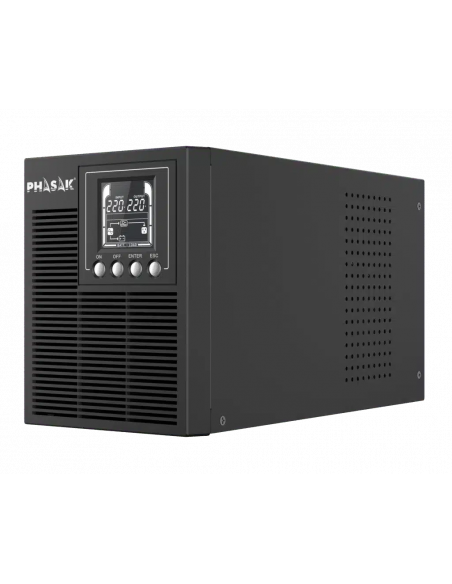 A UPS Phasak Smart Pro 1000VA é uma unidade de alimentação ininterrupta (SAI) online, projetada para proteger equipamentos eletrónicos sensíveis contra falhas de energia e flutuações da rede elétrica. Este modelo utiliza tecnologia de dupla conversão real, garantindo um fornecimento de energia limpa e estável aos dispositivos conectados.