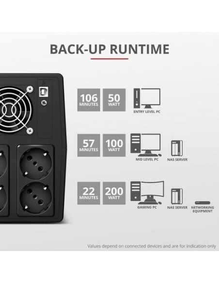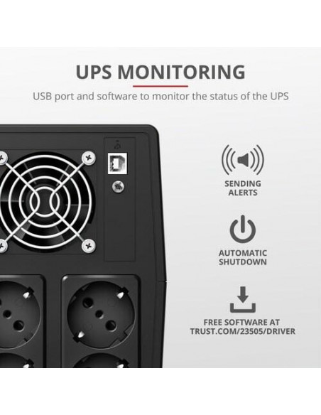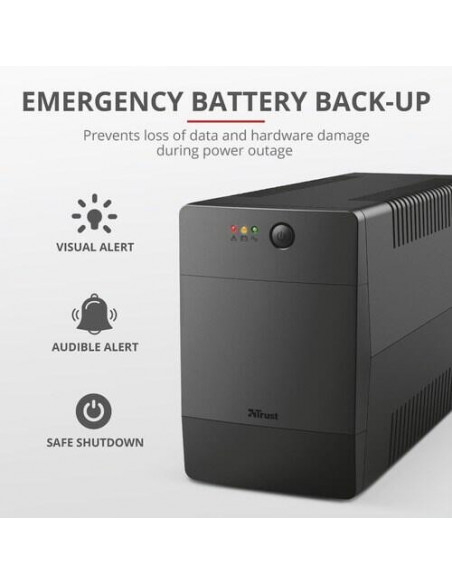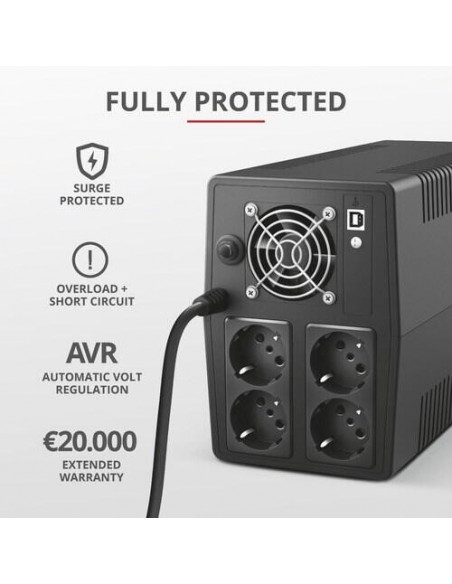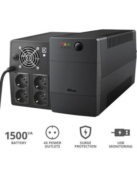 O UPS Trust Paxxon 1500VA garante a segurança dos seus equipamentos eletrônicos, fornecendo energia de reserva durante quedas de energia e protegendo-os contra sobretensões. Com uma potência de 1500VA/900W, é ideal para proteger computadores, televisores, consolas de jogos, sistemas de alarme e outros dispositivos conectados às suas quatro tomadas Schuko. O sistema AVR (regulador automático de tensão) garante estabilidade de energia, mesmo com flutuações na rede elétrica. A bateria de chumbo-ácido (12V, 9000mAh, 2 baterias, 24V DC) oferece um tempo de funcionamento de até 1,33 minutos com carga completa e 7 minutos com carga parcial. O tempo de recarga completa é de 8 horas. Seu design compacto permite montagem na parede, economizando espaço. Fácil de usar e instalar, o Paxxon 1500VA proporciona tranquilidade e proteção aos seus valiosos dispositivos. Para mais informações, consulte o site do fabricante.