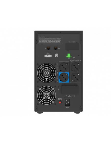 Esta UPS possui um Regulador Automático de Tensão (AVR) que estabiliza a voltagem, e produz uma onda sinusoidal pura, ideal para equipamentos sensíveis. Inclui proteção contra picos de corrente e reinicialização automática, o que facilita a utilização e manutenção. A função de arranque a frio permite iniciar a UPS mesmo sem energia da rede. Dispõe ainda de uma slot para instalação de um módulo SNMP (opcional), permitindo a gestão remota da unidade.