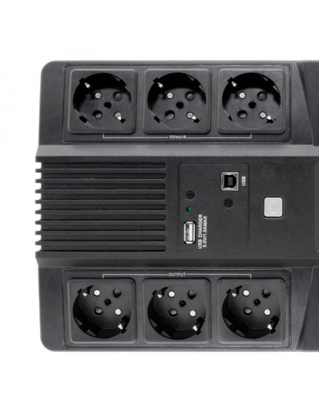 O Scudo3 disponibiliza 6 tomadas Schuko, sendo 3 delas alimentadas pela bateria durante cortes de energia, permitindo priorizar a proteção dos equipamentos mais críticos. Para além das tomadas, possui ainda um porto USB para ligar o SAI a um PC e dois portos RJ-45 (entrada e saída) para proteger a sua rede contra picos de tensão. A forma de onda sinusoidal simulada garante a compatibilidade com uma vasta gama de equipamentos eletrónicos. A bateria de 12V/9Ah proporciona até 8 minutos de autonomia a plena carga, e demora entre 6 a 8 horas a carregar até 90% da sua capacidade.