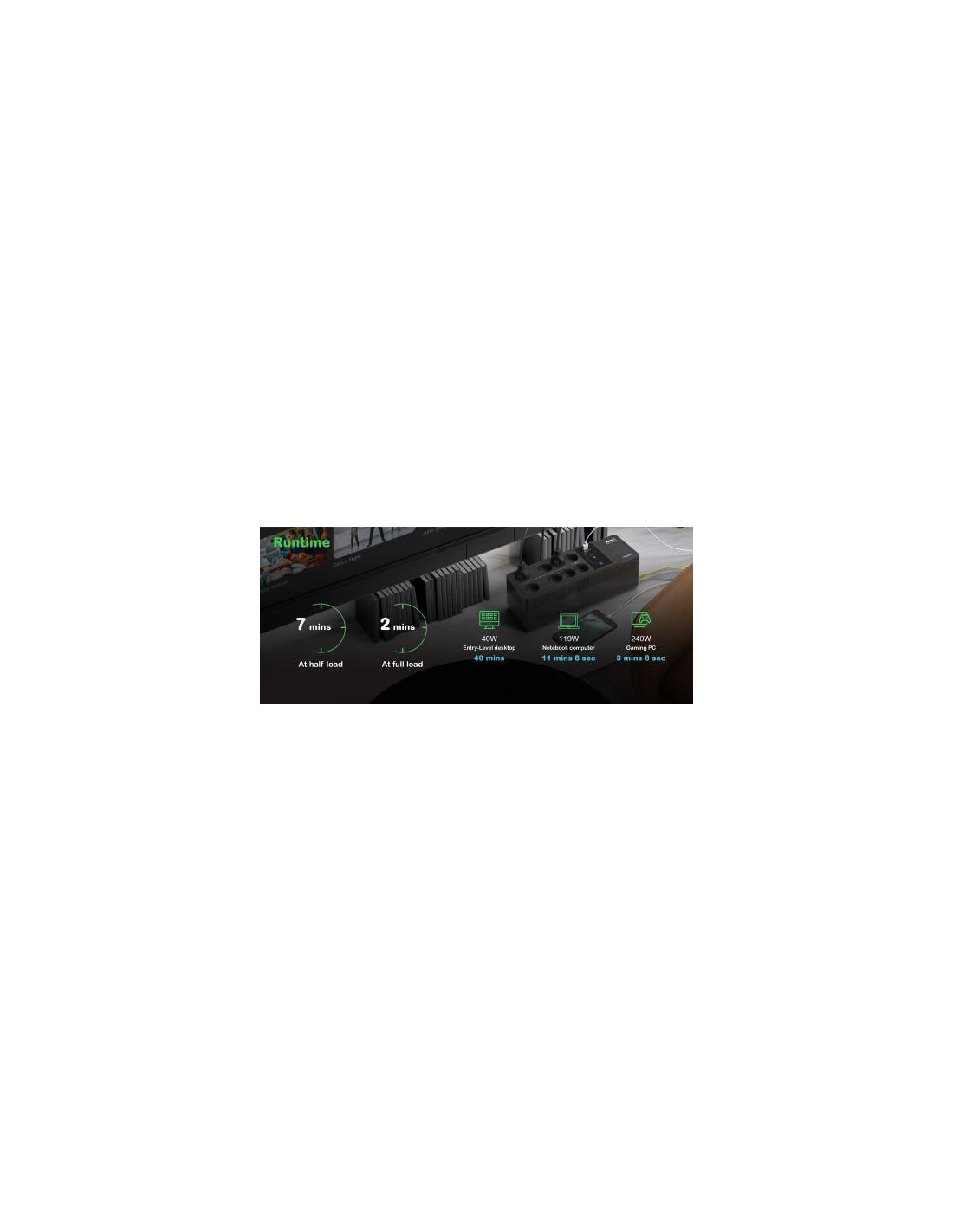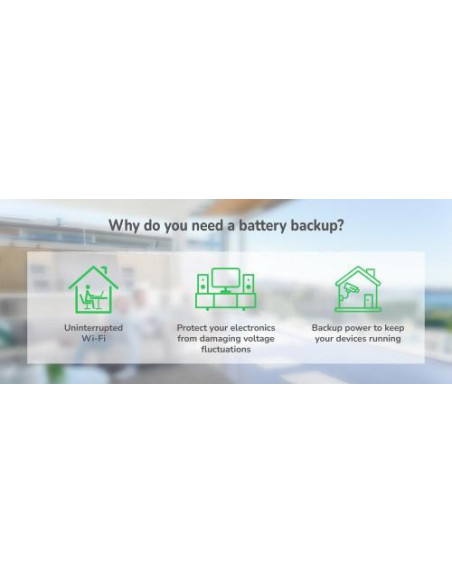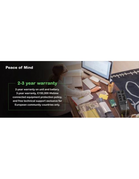 A bateria interna de chumbo-ácido com 9Ah fornece um tempo de autonomia suficiente para gravar dados e desligar o seu sistema, evitando perda de trabalho ou danos aos seus equipamentos. O tempo de recarga da bateria é de 6 horas. O UPS inclui proteção contra sobrecargas, garantindo que a sua instalação está segura. A forma de onda de saída é progressiva. O tempo de resposta do UPS é de 6ms, minimizando o tempo de interrupção em caso de falha de rede. A eficiência do UPS é de 80%.