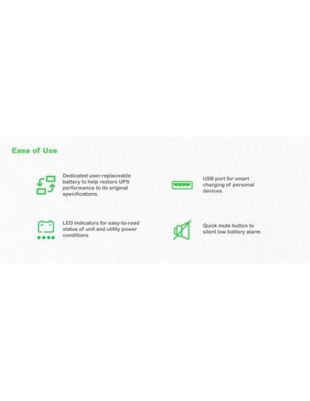 O Back-UPS BE500G2-GR é ideal para proteger computadores, servidores e outros equipamentos eletrônicos sensíveis contra problemas de energia. O seu design compacto e funcional facilita a sua integração em qualquer ambiente de trabalho. É fácil de instalar e de utilizar. O UPS tem dimensões de 130 mm de largura, 365 mm de profundidade e 120 mm de altura. É certificado CE e EAC.