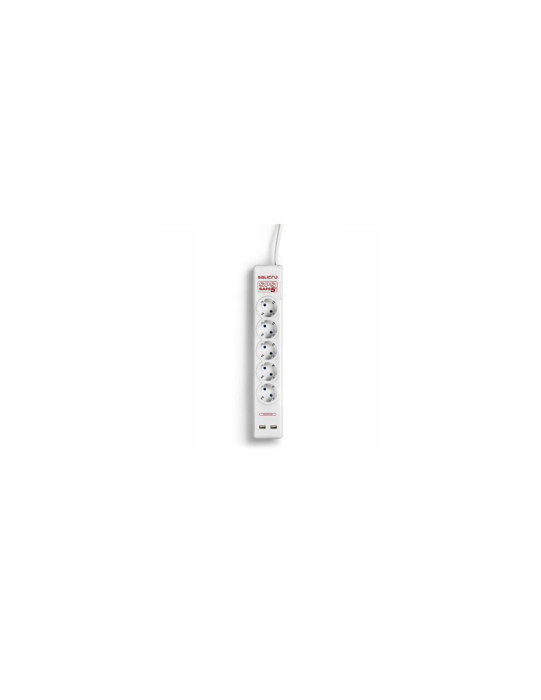 Regulador de energia Salicru SPS SAFE 5+, com 5 tomadas AC e 2 portas USB para carregamento de dispositivos eletrónicos. Oferece proteção contra sobretensões e picos de energia. Cabo de 1,5m. Inclui proteção para crianças. Ideal para proteção de equipamentos eletrónicos em escritórios e casas. Informações adicionais sobre proteção, certificações e características técnicas são fornecidas em separado.
