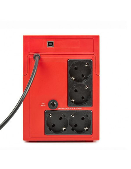 O tempo de recarga da bateria é de 90% em 4 horas. A função de arranque a frio permite ligar o computador mesmo sem energia da rede eléctrica, utilizando apenas a bateria do SAI. A bateria é do tipo Plomo-Cálcio (Pb-Ca). O SAI cumpre com as normas de segurança EN 62040-1-1 e EN-60950-1 e possui as certificações EN 62040-2, EN 62040-3, ISO-9001 e ISO-14001. O nível de ruído é de 40 dB. O SAI inclui proteções contra descarga da bateria, sobrecarga e curto-circuito. A forma de onda é pseudo-senoidal e inclui a função de auto-restart. O código SA é 85078000.