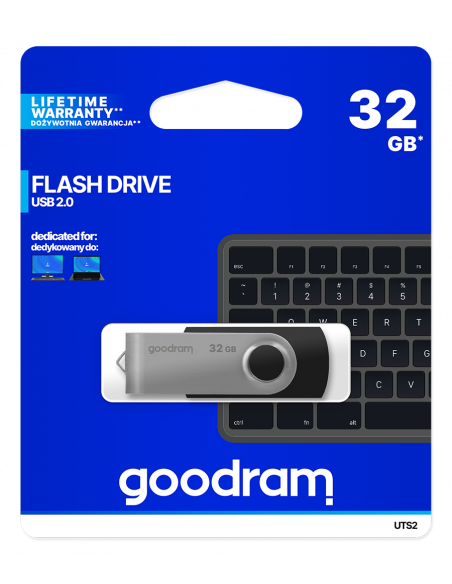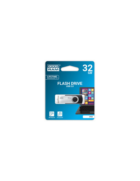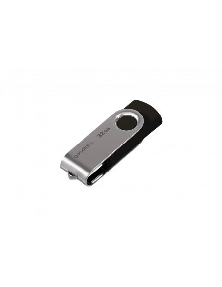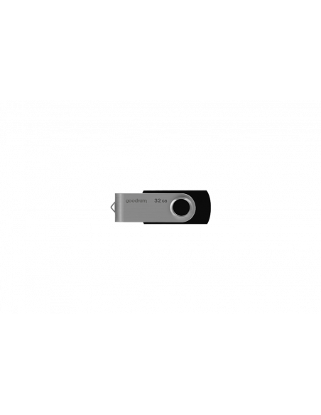 Goodram UTS2. Capacidade: 32 GB, Interface de dispositivo: USB Type-A, Versão USB: 2.0, Velocidade de leitura: 20 MB/s, Velocidade de escrita: 5 MB/s. Forma: Rotação. Peso: 15 g. Cor do produto: Preto