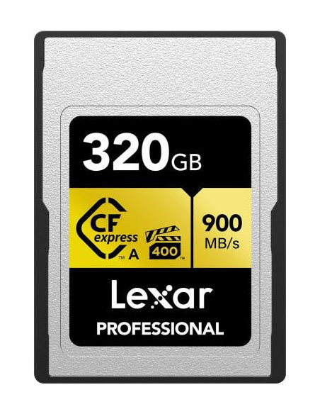 Cartão CFexpress Tipo A profissional da Lexar, com capacidade de 320 GB. Oferece velocidades de leitura de até 900 MB/s e de escrita de até 800 MB/s, garantindo desempenho excepcional.  A tecnologia VPG 400 assegura gravação de vídeo de alta qualidade. Construído para resistir a impactos, variações de temperatura e vibrações.  Disponível na cor prata.