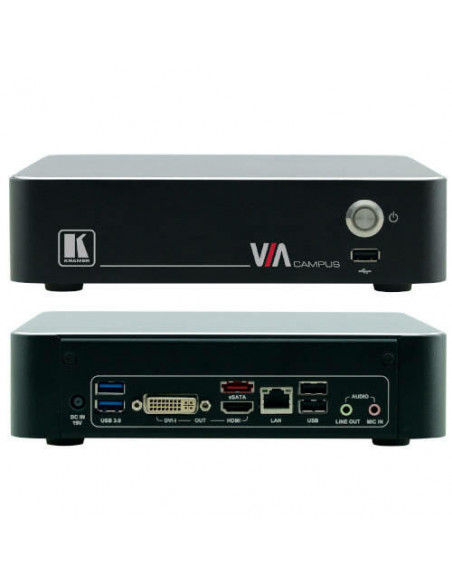 Kramer Electronics VIA Campus². Factor de forma: Escritorio, Color del producto: Negro. Frecuencia del procesador: 3,6 MHz, Formato de vídeo soportado: 2160p, Capacidad de RAM: 8 GB. Tipo de antena: Externo, Tipo de conector de antena: RP-SMA. Wi-Fi estándares: Wi-Fi 5 (802.11ac), Estándar Wi-Fi: Wi-Fi 5 (802.11ac), Modelo de controlador WLAN: Intel Dual Band Wireless-AC 3168. Interfaz: HDMI