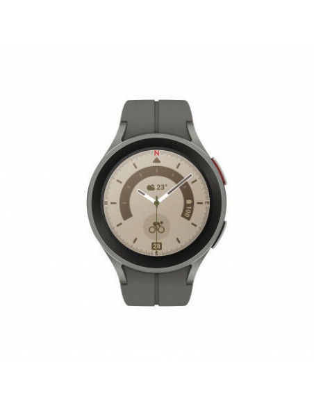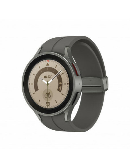 Samsung Galaxy Watch5 Pro. Tamanho do ecrã na diagonal: 3,56 cm (1.4"), Tecnologia de apresentação: Super AMOLED, Resolução: 450 x 450 pixels, Ecrã táctil. Frequência do processador: 1180 MHz, Capacidade RAM: 1500 MB, Memória flash: 16 GB. Wi-Fi. GPS. Capacidade da bateria: 590 mAh. Peso: 46,5 g. Humidade: À prova de água até: 50 m, Cor da pulseira: Cinzento. Sistema operativo instalado: Wear OS
